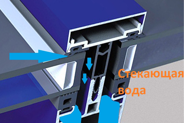 Данное нарушение вызвано ошибкой проектировщика, который не учел особенности алюминиевого профиля конструкции остекления и не предусмотрел отвод воды из водоотводной канавки алюминиевого профиля конструкции остекления.