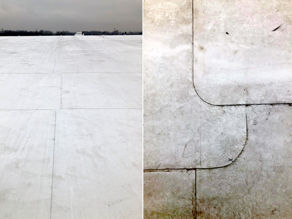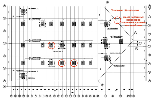 С отметкой мест частичных непроваров элементов усиления ТПО мембраны.